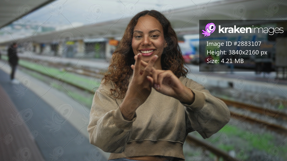 Woman forming a hashtag sign with hands while smiling at camera on a street platform by railway tracks in an outdoor station; youthful joy trend.