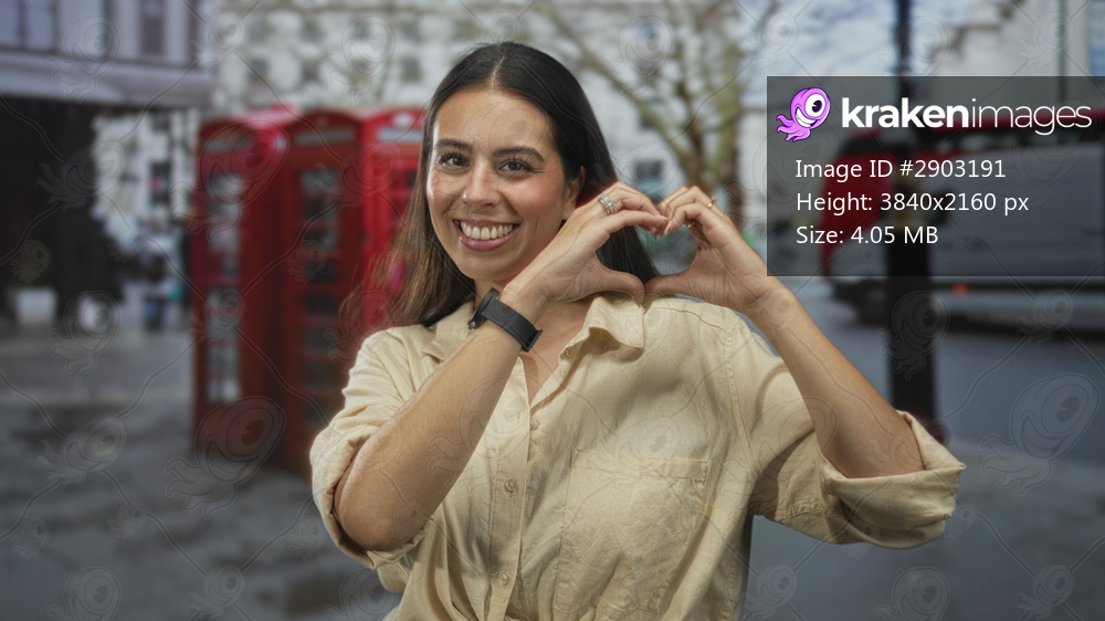 Woman forming a heart with hands on a city street by red telephone booths, smiling in beige shirt and showing rings on fingers; joy love.