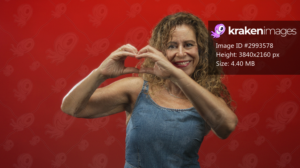 Woman forming a heart with hands and smiling, denim dress against red studio backdrop; joyful love warmth.