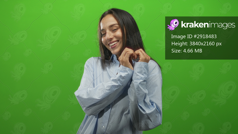 Woman forming a heart with hands and smiling shyly, hands held near chest in green studio setting; warm affection.