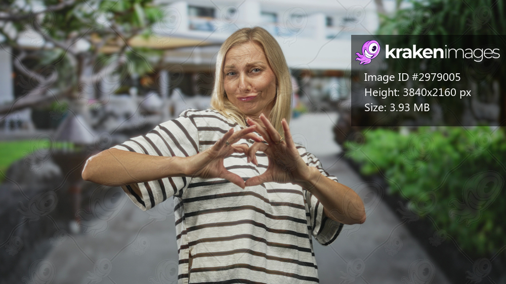 Woman forming a heart with hands and smiling, striped shirt and extended arms in a building courtyard lined with plants and a walkway; playful joy.