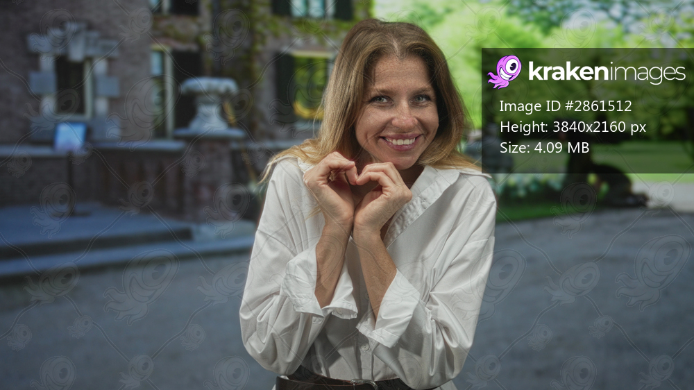 Woman forming a heart with her hands while smiling in a white shirt in front of a building courtyard; love connection.