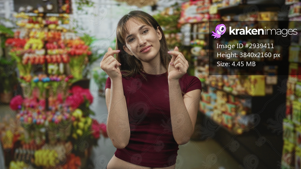 Woman forming finger heart gesture by flower display inside a building shop, wearing burgundy crop top; playful youth market life.