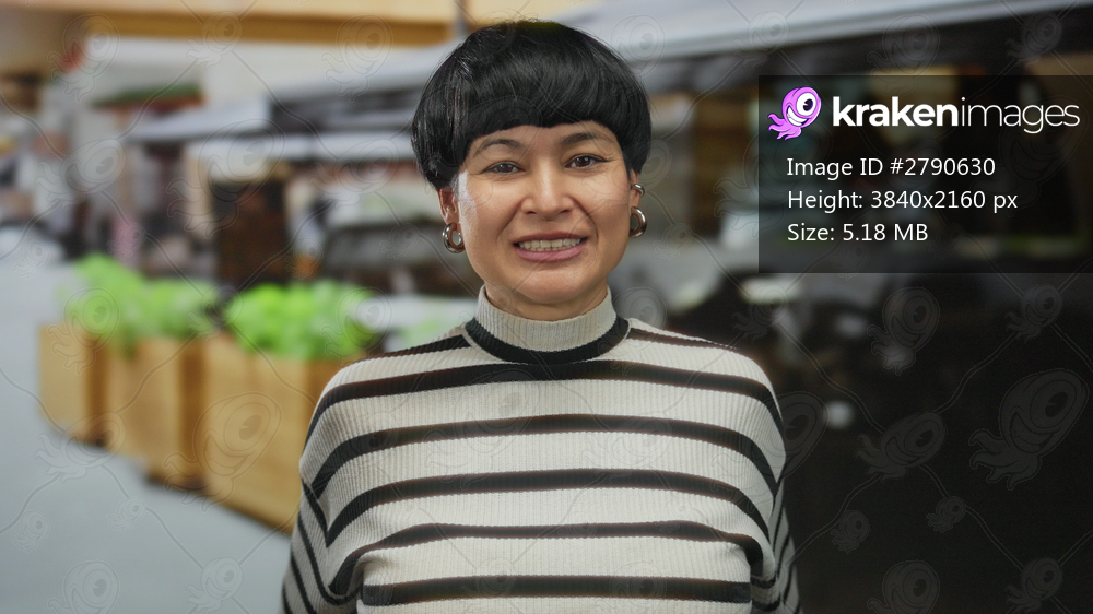Woman forming glasses with fingers playfully at an outdoor terrace restaurant, in a striped sweater, showcasing casual ambiance with plants and structures behind her. - Kraken Images