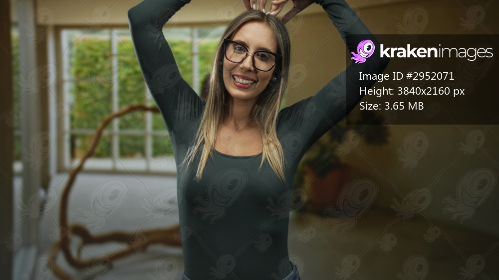Woman forming heart with hands above head and showing chest in building smiling with glasses and blonde hair; joy love.