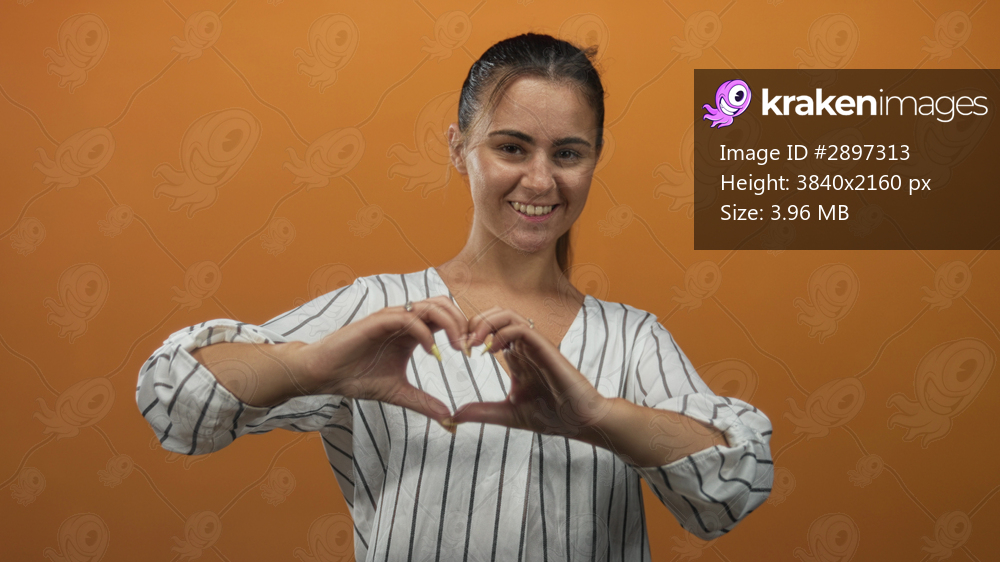 Woman forming heart with hands in orange studio, smiling and showing rings on fingers; love joy warmth.