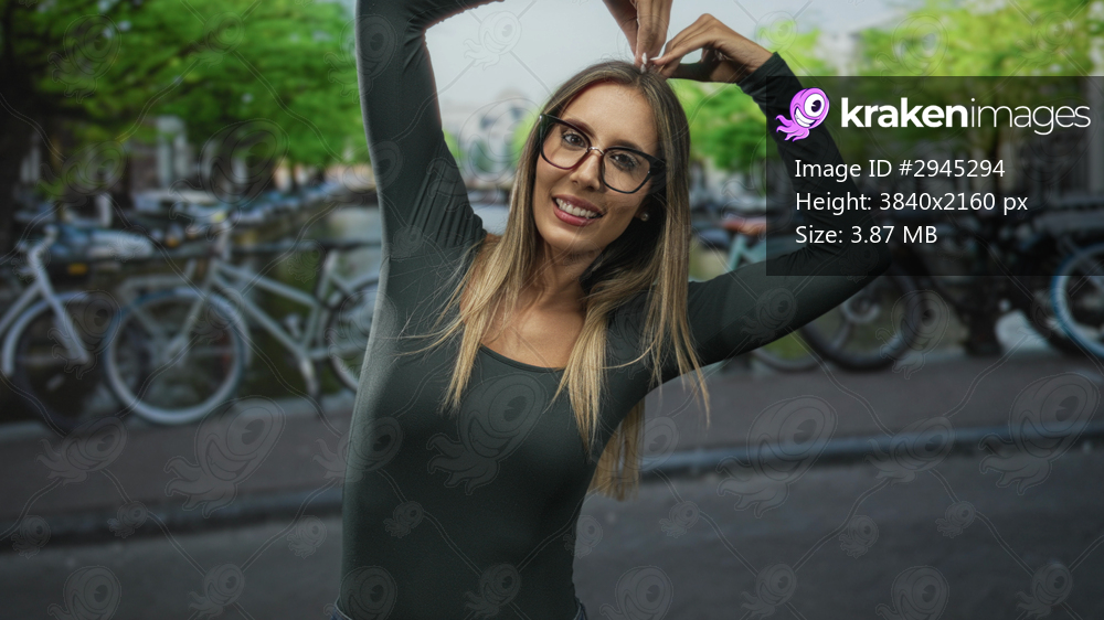 Woman forming heart with hands on street by an amsterdam canal with parked bicycles and glasses on face; urban joy.