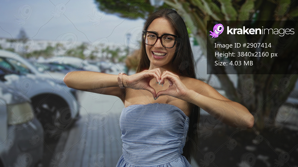 Woman forming heart with hands on street near parked cars wearing glasses and strapless dress; love support.