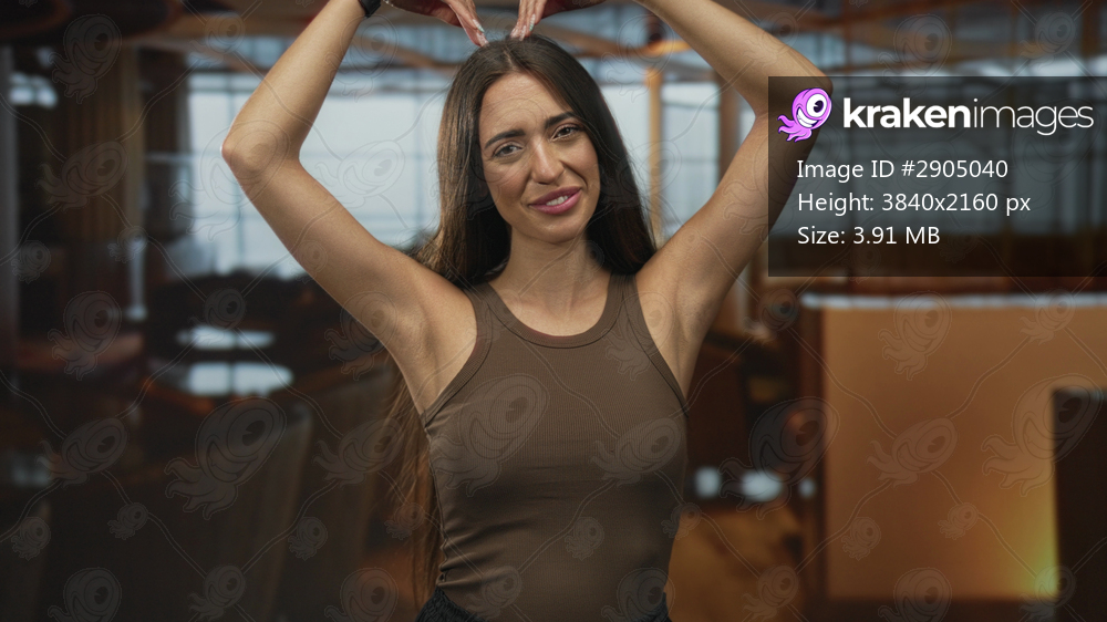Woman forming heart with hands and raised arms showing armpits in restaurant building interior; happiness affection.