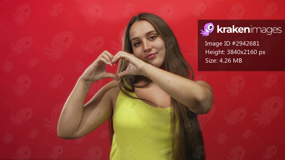 Woman forming heart with hands and smiling toward camera in red studio with long hair and visible freckles; affection.
