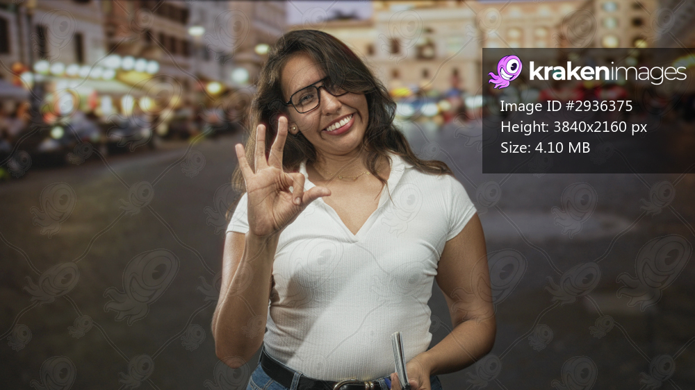 Woman forming heart with hands while holding notepad and pen on a busy city street with blurred lights at dusk; affection connection.