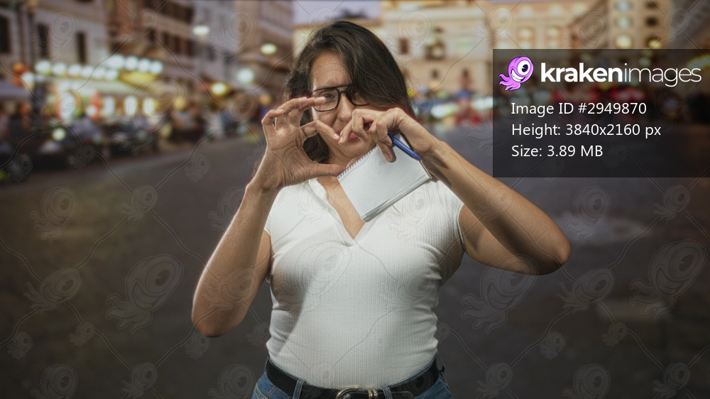Woman forming heart with hands while holding notepad and pen on a busy city street with blurred lights at dusk; affection connection.
