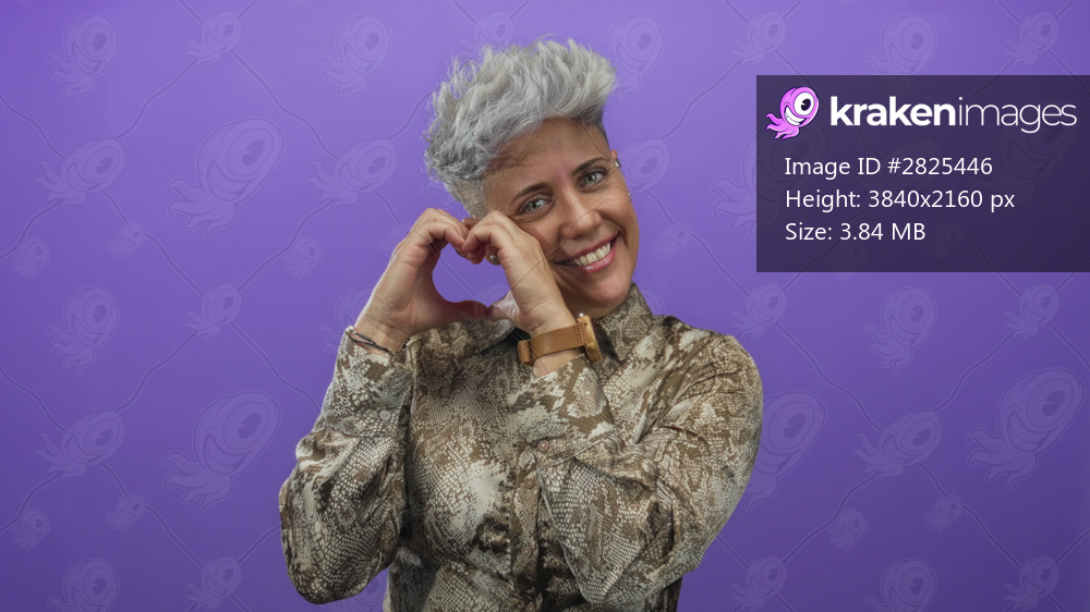 Woman forming heart shape with hands in studio wearing snakeskin shirt and smiling; love affection joy warmth.