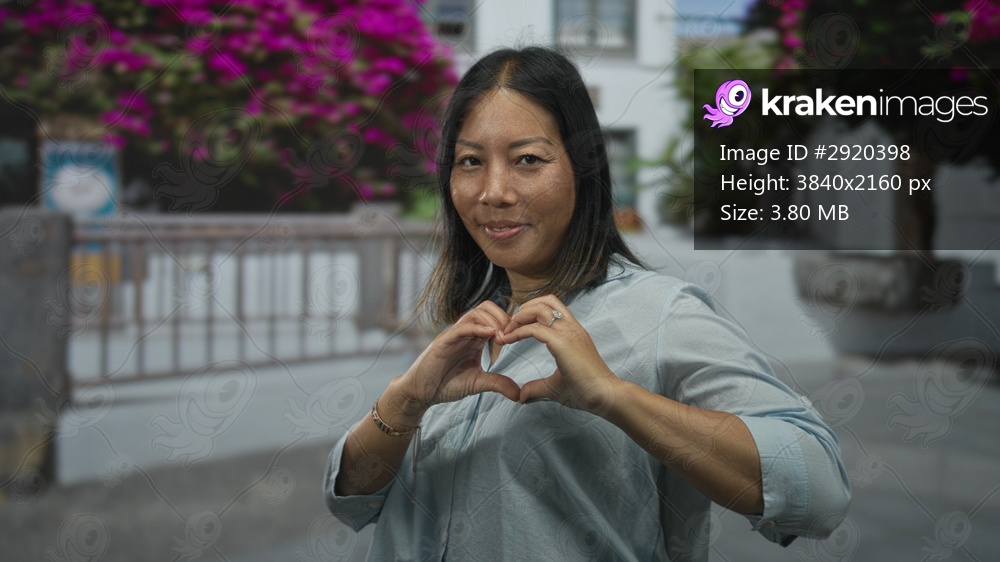 Woman forming heart shape with hands on city street by flowering bougainvillea and low railing, facing camera, casual shirt; love kindness.
