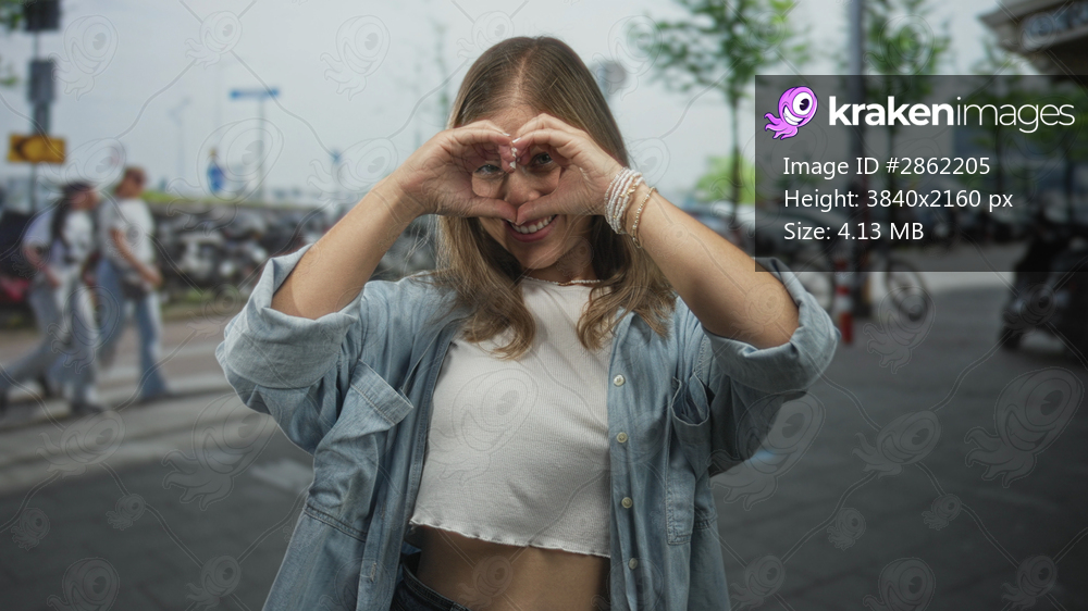 Woman forming heart shape with her hands in playful gesture on busy urban street near bicycles and cars; love.