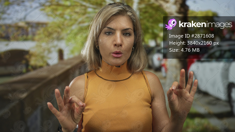 Woman forming ok sign with hands and breathing deeply on street beside parked cars under trees; calm approval.