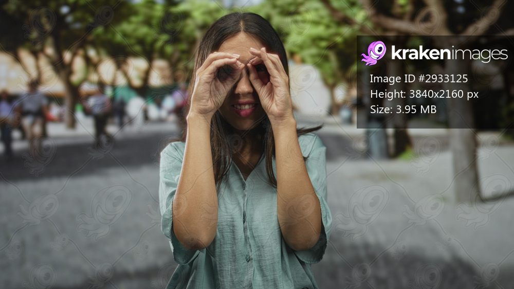 Woman forms hand binoculars with hands on a city street, forearms visible near trees and benches; playful curiosity.