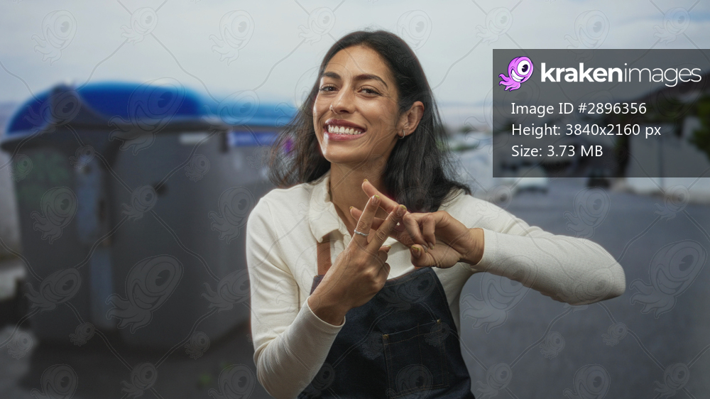 Woman forms hashtag with fingers in front of recycling container on street wearing apron; recycling awareness playful.