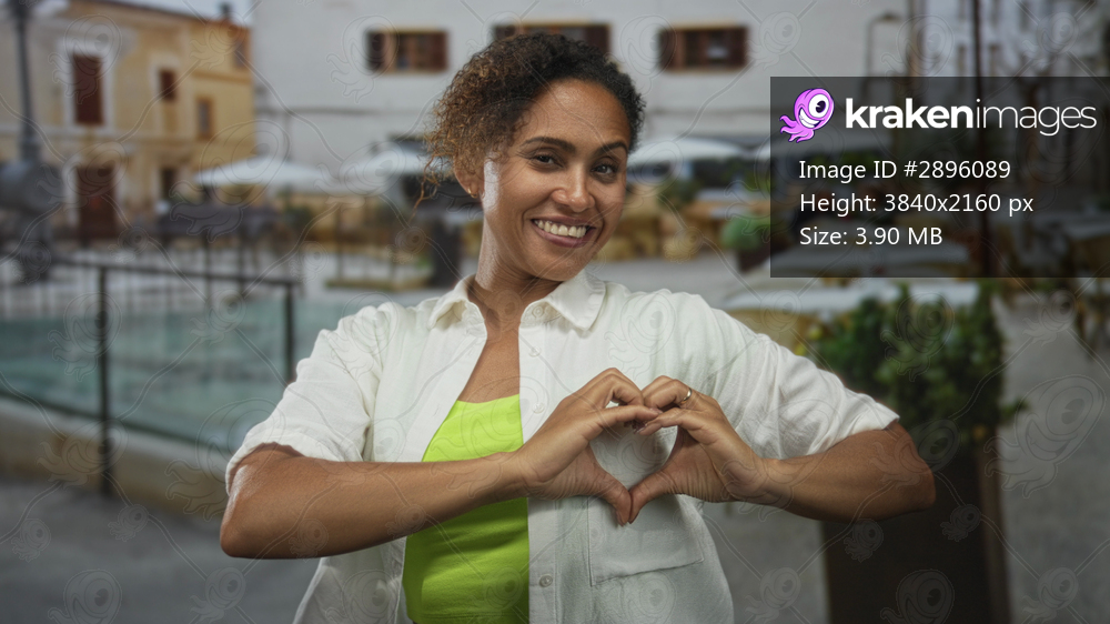 Woman forms heart with hands at street cafe terrace, bare forearms visible and smiling while facing camera; love connection joy.