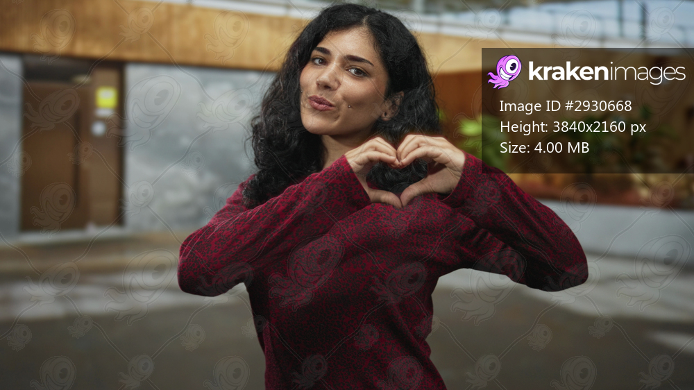 Woman forms heart with hands in front of a modern public building courtyard under daylight; affection unity.