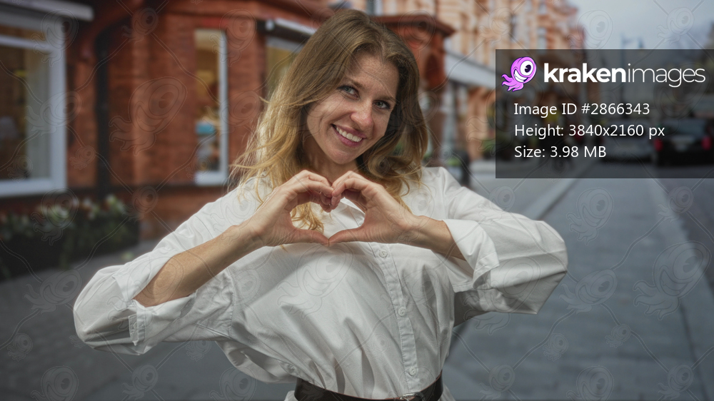 Woman forms heart with hands on a busy city street wearing a white shirt and belt, smiling broadly while leaning slightly forward; warm love.