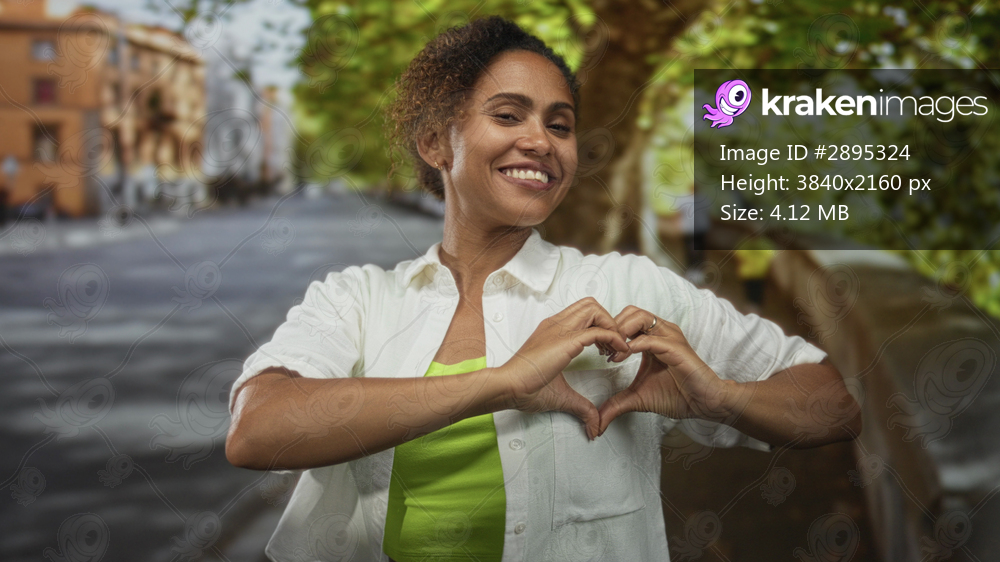 Woman forms heart with hands on street wearing white shirt and lime green top, smiling with closed eyes by tree lined walkway; love happiness.