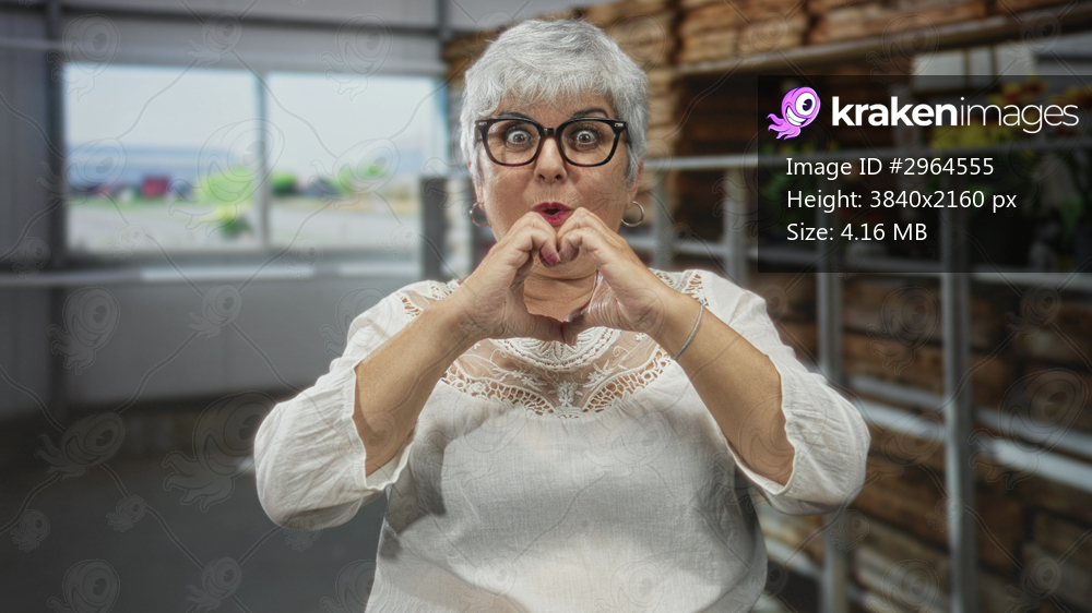 Woman forms heart with hands over eyes while peeking through glasses, wearing white lace blouse in greenhouse aisle with plants and wooden crates; joyful affection. - Kraken Images