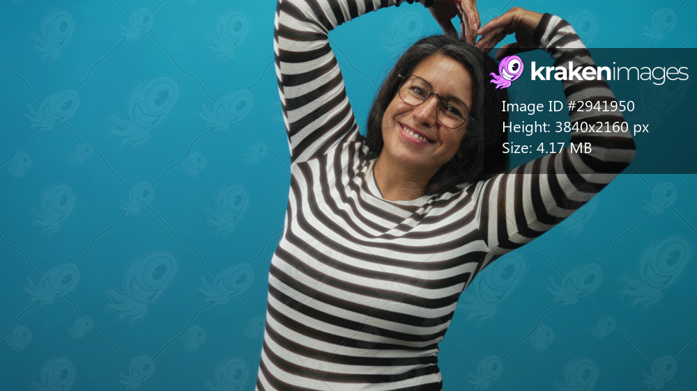 Woman forms heart with hands over head, smiling in striped sweater with visible face against blue studio backdrop; joy love warmth.