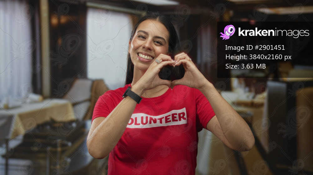 Woman forms heart with hands over red volunteer shirt in building dining area, smiling brunette showing ring and smartwatch; kindness joy.