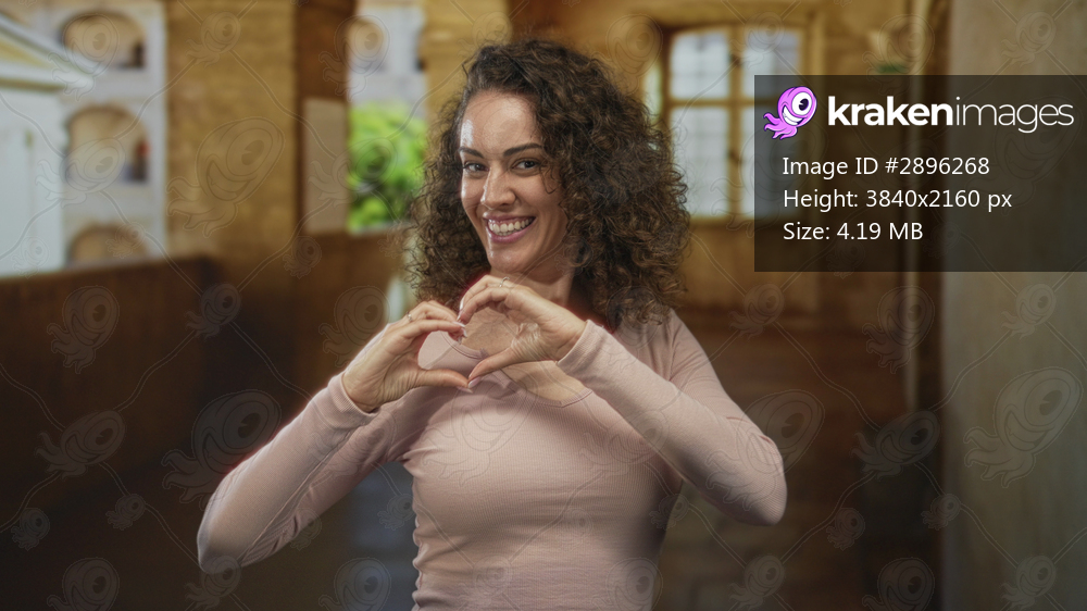 Woman forms heart with hands and smiles in an old town building corridor while wearing a pink top and rings; joy connection.