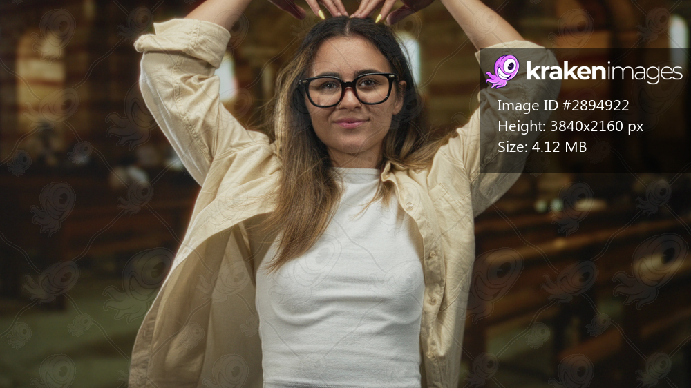 Woman forms heart with hands and smiles inside church building, wearing glasses and a white tee with beige overshirt; faithful serenity.
