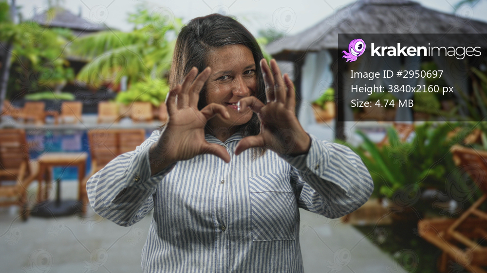 Woman forms heart with hands and smiles, visible hands near chest in resort building cabana pool area; joy affection.