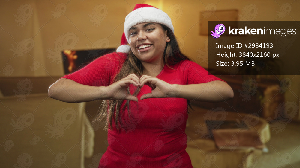 Woman forms heart with hands and smiles wearing santa hat and red top in living room; holiday joy love.
