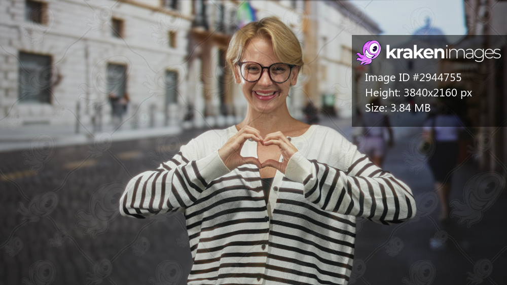 Woman forms heart with hands, smiling in glasses and striped sweater on a cobblestone street with historic buildings; love joy.