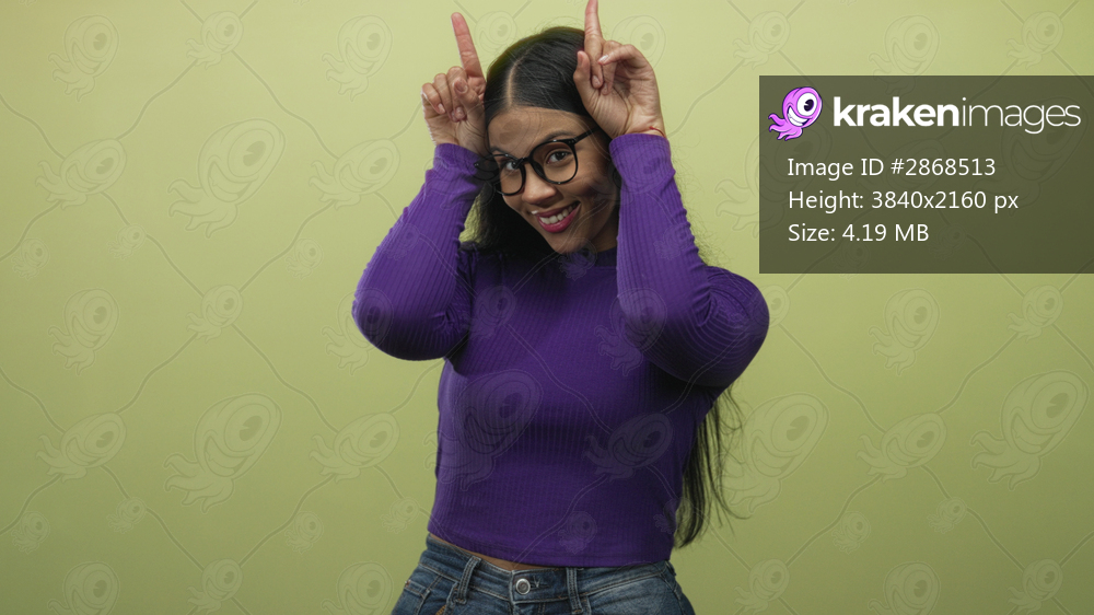 Woman forms horns with fingers in studio while smiling in a purple top and jeans with glasses; rock metal fun.