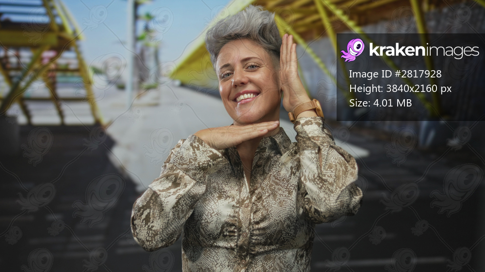 Woman frames face with hands on sunlit urban street beside yellow scaffolding; confidence empowerment.