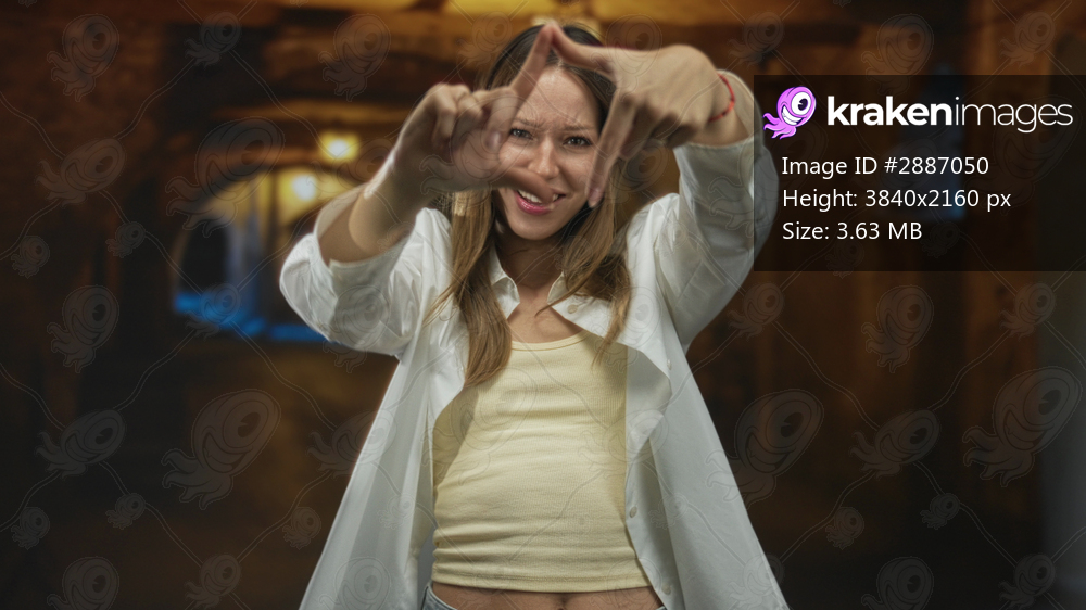 Woman frames face with hands wearing white shirt and yellow tank top on a street in old town; playful creativity.