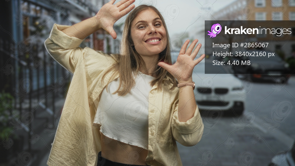 Woman frames face with raised hands on central city street in daylight while smiling brightly; playfulness.