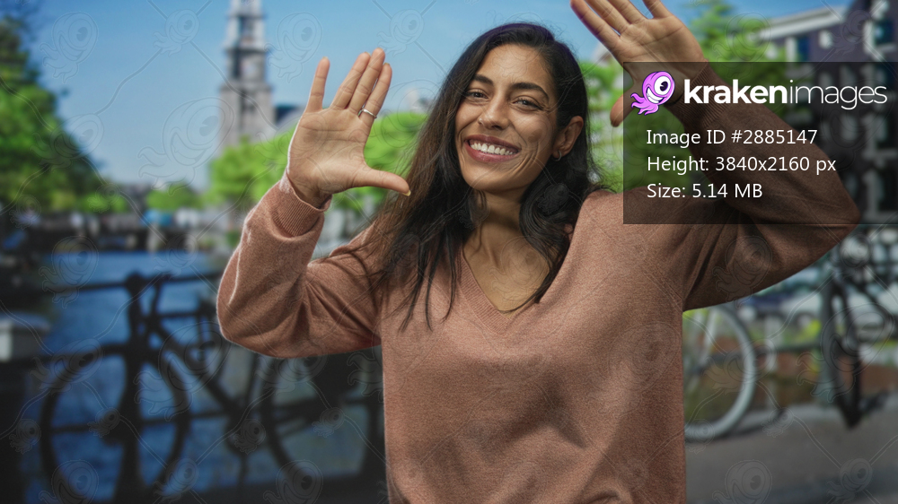 Woman frames her face with both hands while smiling on a street in amsterdam, rings visible on fingers and a brown sweater against canal and bicycle railings; joy confidence. - Kraken Images