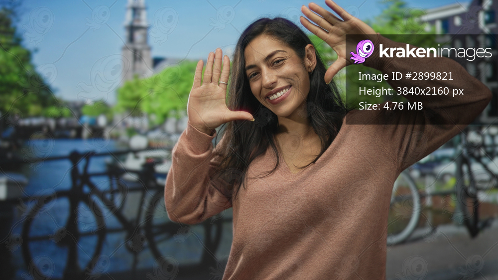 Woman frames her face with both hands while smiling on a street in amsterdam, rings visible on fingers and a brown sweater against canal and bicycle railings; joy confidence. - Kraken Images