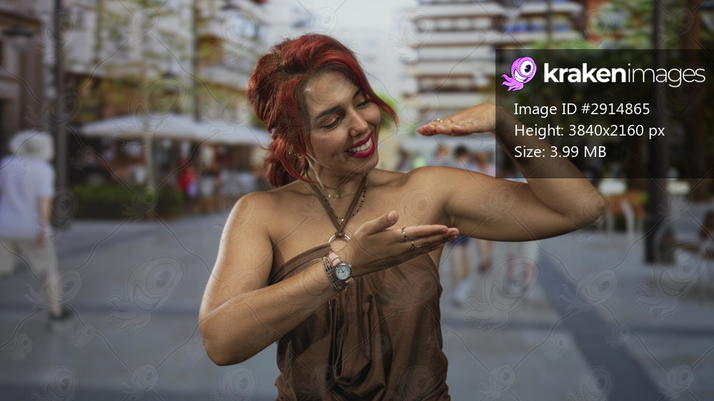 Woman frames space with hands and bare arm on a busy city street, smiling broadly; joy playful confidence.