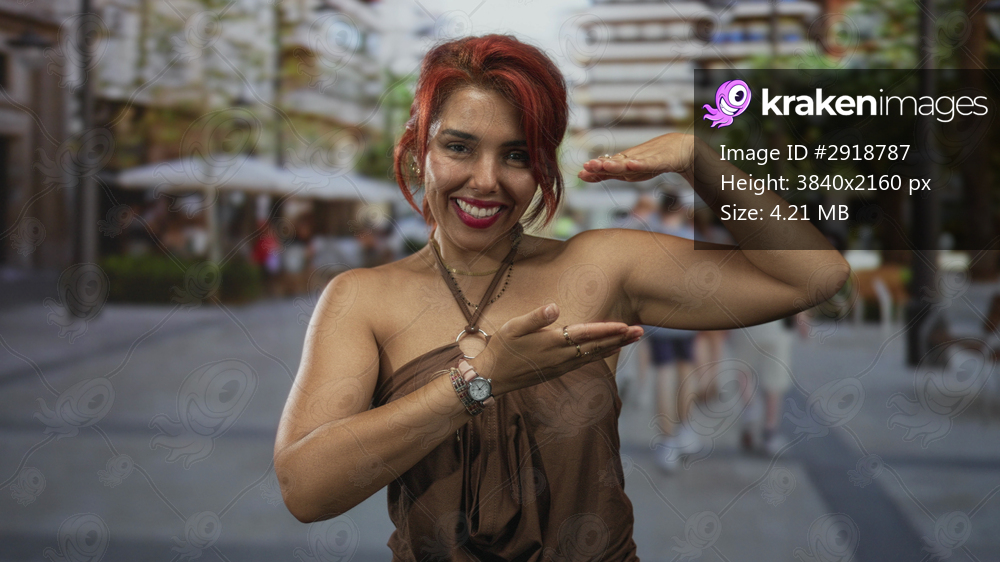 Woman frames space with hands and bare arm on a busy city street, smiling broadly; joy playful confidence.