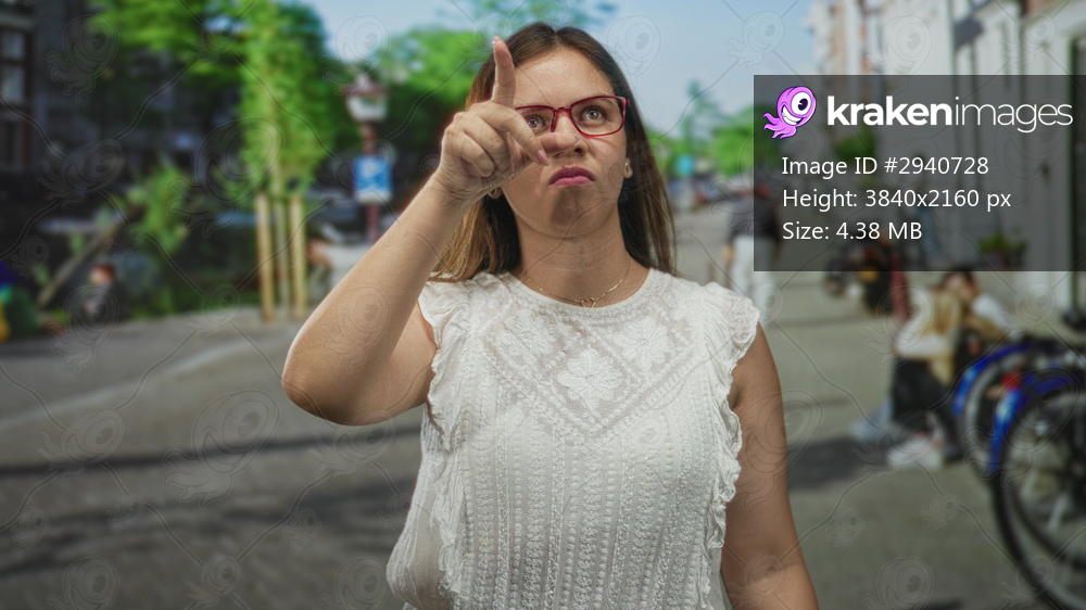 Woman framing a view with fingers and pointing upward while wearing red glasses on a busy city street; focus.