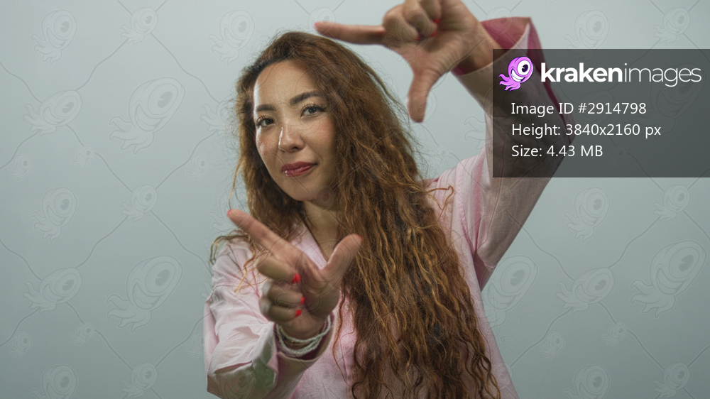 Woman framing face with hands in studio against pale blue backdrop, wearing pink shirt and bracelets; creative playful.
