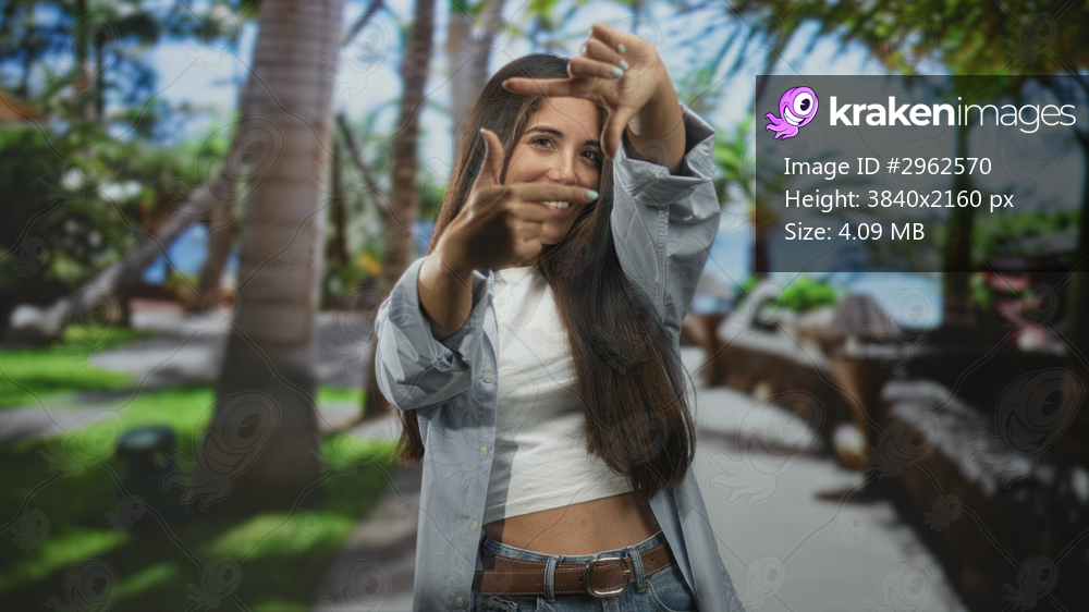 Woman framing face with hands on a beachside promenade street wearing crop top and jeans; playful confidence.