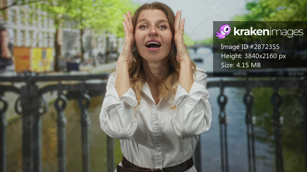 Woman framing face with hands on amsterdam canal street bridge smiling while wearing white shirt and belt; joy playfulness.