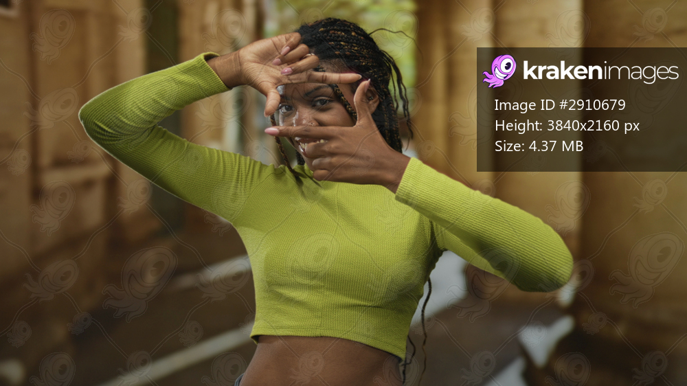 Woman framing face with hands on old town street beside stone columns wearing green crop sweater; playful confidence.