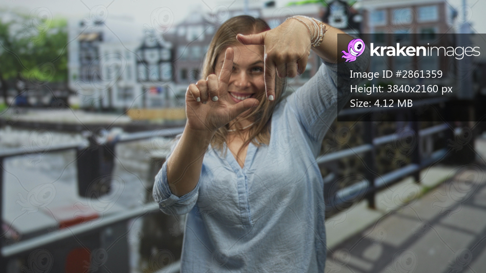 Woman framing gesture with hands by canal railing on street near water and brick houses; inspiration.