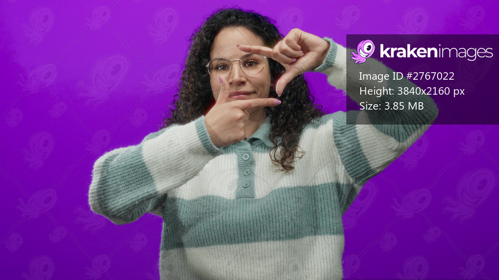 Woman framing gesture wearing glasses and striped sweater against vibrant purple background, emphasizing creativity and self-expression in modern visual culture. - Kraken Images