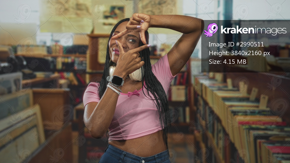 Woman framing with hands and headphones around neck in a library aisle, pink crop top and smartwatch visible; playful creativity focus.